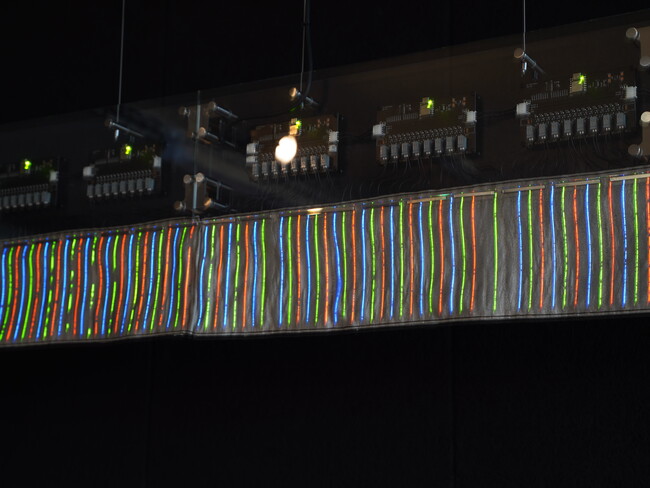 紐状の有機ELを織り込み、通電すると3色に発光する西陣織。緯糸にEL(エレクトロルミネセンス)の素材を織り込んで、それをコンピューターで制御することでアニメーションのように布の柄を切り替えることができます。