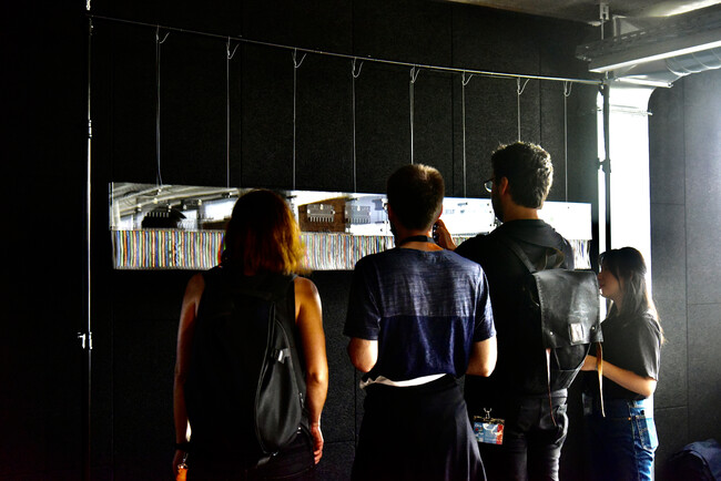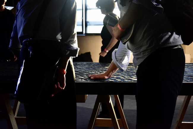 今回、織機の音に連動したビジュアル表現をベースに、会場での物音を検知すると、光り方が変わるインタラクションを追加。多くの来場者が、そのライブ感に興味を持った様子でした。