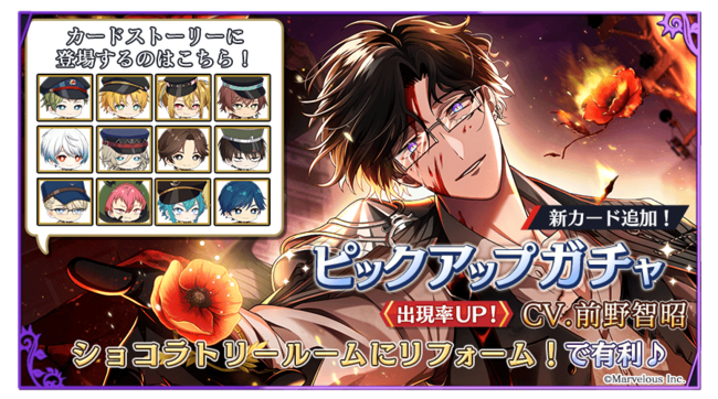 株式会社マーベラス(代表取締役社長:佐藤 澄宣/所在地:東京都品川区)による、スマートフォンゲーム『千銃士:Rhodoknight』(読み:せんじゅうし ろーどないと 以降、『千銃士R』)は、9月16日より開催中のイベント「ショコラトリールームにリフォーム!」にあわせて、イベント内で活躍する★3「【絶望の先で嗤う】ファル(CV:前野智昭)」の新カードがピックアップで登場する期間限定ガチャを開催いたします。