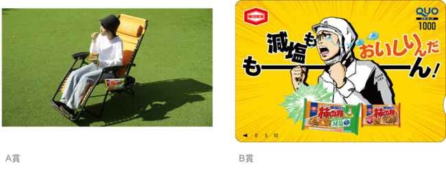 A賞:「亀田の柿の種オリジナル アウトドアチェア」を300名様にプレゼント。『減塩 亀田の柿の種』を座って快適にお楽しみいただける、ストレスフリーな設営・収納・座り心地の、3拍子揃ったオリジナルチェアです。