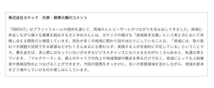 移住や関係人口促進のためのマッチングサービス「SMOUT」を運営する株式会社カヤック(本社:神奈川県鎌倉市、代表取締役CEO:柳澤大輔、以下「カヤック」)と、全国約40エリア以上で地方創生事業のプロデュースを行う株式会社さとゆめ(本社:東京都千代田区代表取締役:嶋田俊平、以下「さとゆめ」)は、業務提携契約に合意しましたのでお知らせいたします。今後、両社のノウハウや強みを活かし、地方自治体への多業(マルチワーク)機会創出のサポート、およびマルチワークに特化したWebサイト「多業多福(たぎょうたふく)」での情報発信を行っていきます。当事業により、「地域に貢献したい」「自分らしい働き方を見つけたい」といった人に新たな選択肢を提供していきます。