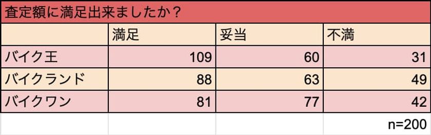 大手のバイク買取業者を利用したことがある人200人に査定額に満足したのかどうかのインタビューを行いました。