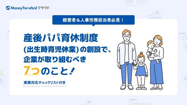 株式会社マネーフォワードは、2022年10月1日より施行される「産後パパ育休制度(出生時育児休業制度)」に関して、企業が対応すべき実務内容をまとめた資料を公開しました。