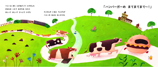 野菜が嫌いでハンバーガーばっかり食べていたら、なんと自分がハンバーガーになってしまったベニー。はらぺこの男の子たちや犬に追いかけまわされる姿を、子どもたちは固唾を飲んで見守ります。