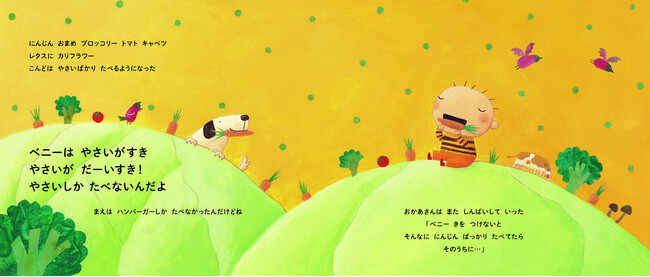 「〇〇ばっかりたべてたら そのうちに…」というお母さんのセリフが大事なポイント。ハンバーガーをやめて野菜ばっかり食べるようになったベニーは、果たしてどうなる……!?