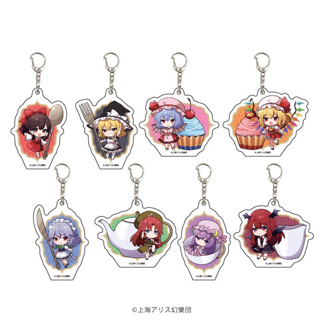 アクリルキーホルダーは大きさおよそ65mm。ティーカップ、ティーポット、ケーキなどと並ぶキャラクターたちの可愛いイラストを使用したアクリルキーホルダーは、カバンやペンケースにつけるほか、お部屋に飾るのもオススメです。