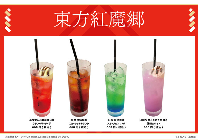 ドリンクは「巫女さんと魔法使いのクランベリーソーダ」、「吸血鬼姉妹のスカーレットドリンク」、「紅魔館従者のブルーメロンソーダ」、「日陰少女とお付き悪魔の巨峰ホワイト」の4種類。