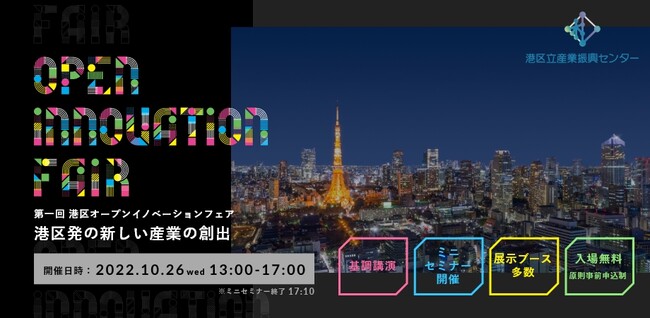 港区立産業振興センター(所在地:東京都港区)では、10月26日に「第一回港区オープンイノベーションフェア」を開催いたします。港区内企業を中心とした多様な事業者が集まり、出展者が優れた技術やサービスを紹介します。そして、会期中は基調講演やブース出展・ミニセミナー・交流会を通して、来場者と事業者間の新たなビジネス連携のきっかけを創出します。