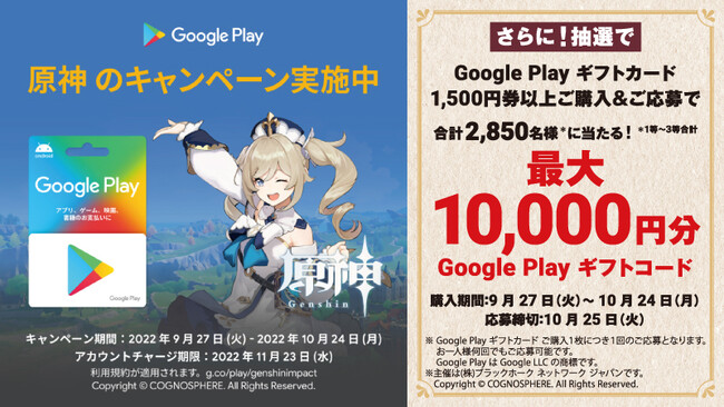 本キャンペーンでは、ローソン店舗で Google Play ギフトカード1,500円券以上をご購入いただくことで、原神のゲーム内アイテムが全員にもらえるキャンペーンや、抽選で Google Play ギフトコードが当たるキャンペーンを実施します。