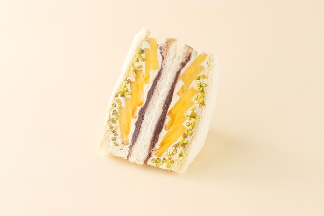 甘みたっぷりの旬の柿を、香ばしいほうじ茶クリームとこしあんでサンドし、上品な味わいに仕上がっています。ピスタチオの色みと食感もアクセントに。