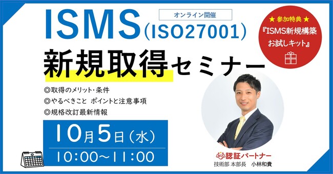 【無料ウェビナー】『ISMS(ISO27001)新規取得 初心者向けセミナー』10/5(水)10:00-11:00開催