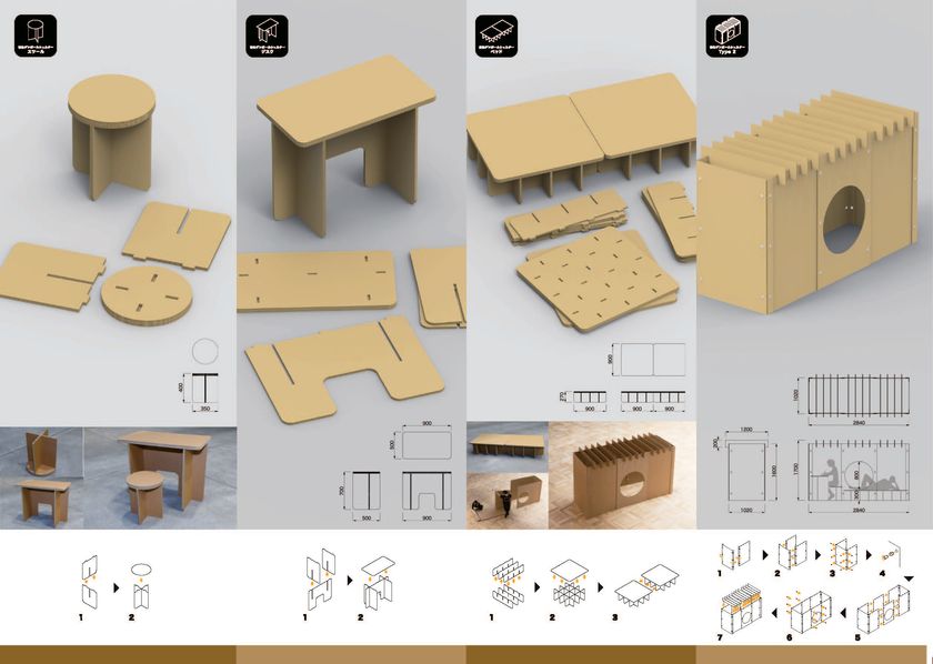 1件目のダンボールシェルターType2は、2011年3月の東日本大震災をきっかけに始まったダンボール家具シリーズの一つで、避難所で個人空間を確保することを目的に、鈴木敏彦教授(建築学部建築デザイン学科)が大幸紙工株式会社と共にデザインと利便性を追求した形状です。