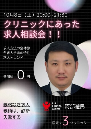 株式会社オール・デンタル・ジャパン(本社:東京都台東区柳橋2-5-6、代表取締役:木下英明、廣田祥司)は、10/8(土)20:00~21:30にて求人相談会を開催いたします。3クリニック限定で各クリニックに寄り添った相談会となります。完全無料ですので、お早めにお申し込みください。