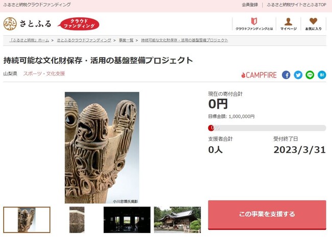 山梨県(知事:長崎幸太郎)とふるさと納税ポータルサイト「さとふる」(https://www.satofull.jp/)を運営する株式会社さとふる(本社:東京都中央区、代表取締役社長:藤井 宏明)は、「さとふるクラウドファンディング」(https://www.satofull.jp/projects/top.php)にて、2022年10月3日より、文化財を次世代へ継承するため、寄付受け付けを開始します。