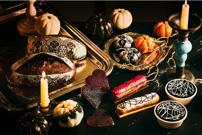 「ヴィンテージ・ゴシック」をテーマに、ビクトリアン調に退廃的でミステリアスなディテールを盛り込んだスイーツ&ブレッドで、幻想的な大人のハロウィンを。蜘蛛の巣をモチーフにしたエクレアやティラミスのほか、美しく繊細なレースの模様が浮かぶハート型のクッキーやかぼちゃあんパン、ダークトーンのカンパーニュなど、モダンで洗練されたスイーツ&ブレッドが、妖しく美しいハロウィンの世界へとあなたを誘います。