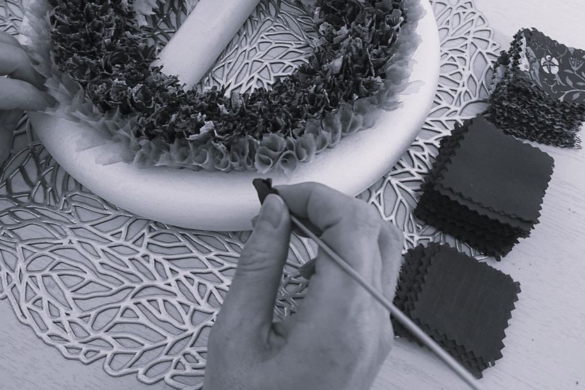 ファブリック(布)を何枚も細かくカットして、ベースに一枚毎に差して形成。