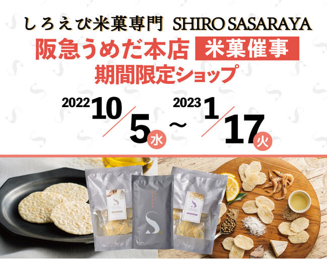 創業98年の老舗米菓メーカー日の出屋製菓産業株式会社(本社:富山県南砺市、代表取締役会長:川合 声一)より、デビュー1周年を迎えた新ブランド、しろえび米菓専門「SHIRO SASARAYA」が、2022年10月5日(水)~2023年1月17日(火)までの3ヵ月間、期間限定ショップを阪急うめだ本店にてオープンします。