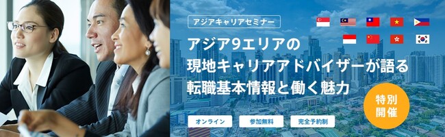 コロナによる移動制限が解除されはじめ、海外求人は増加傾向にあります。特に、アジア各国では日系企業の動きが活発になっています。本セミナーでは、パーソルグループアジア9エリアの現地キャリアアドバイザーが、各国の採用ニーズや最新の転職情報をお伝えいたします。本セミナーに参加することで、アジア9エリアの転職情報・生活情報を得ることができます。
