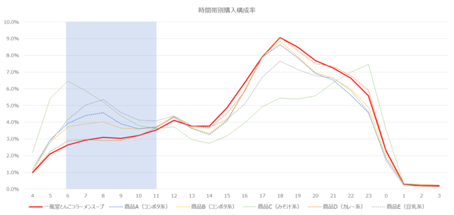 「とんこつスープ」は、14時台から23時台にかけて構成比率が高い一方、5時台から10時台の時間帯が比較的低くなっています。「クリームシチュー」は寒い朝に飲みたくなる缶スープとして、お楽しみください。