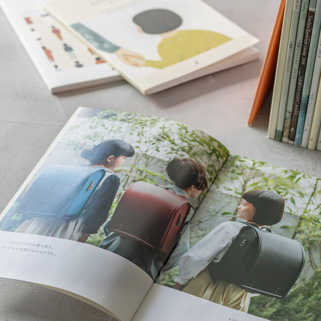 ランドセルは子どもの成長を祝う贈り物であることから、当社のカタログは「製品カタログ」の役割だけではなく、メッセージとあわせて子どもの成長を辿るアルバムのような一面もあります。制作は社内のクリエイティブチームが行い、(一社)日本印刷産業連合会・産経新聞社が主催する「全国カタログ展」では複数回受賞するなど、デザイン面でも注目を集めています。