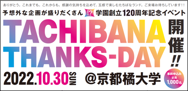 学校法人京都橘学園は、学園創立120周年記念イベント『TACHIBANA THANKS-DAY』を2022年10月30日(日)に、京都橘大学にて開催します。