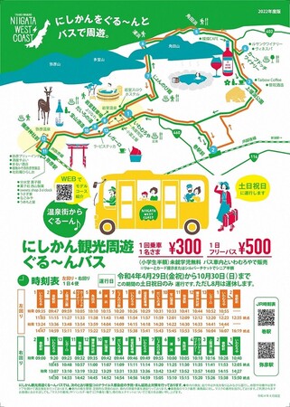 当日は、駐車場や周辺道路の渋滞が予想されますので渋滞緩和のため「にしかん観光周遊ぐる~んバス」(別紙)をぜひご利用ください。越後線 巻駅と上堰潟公園・カーブドッチ・岩室温泉・彌彦神社等を巡り10月30日までの土日祝日運行しています。