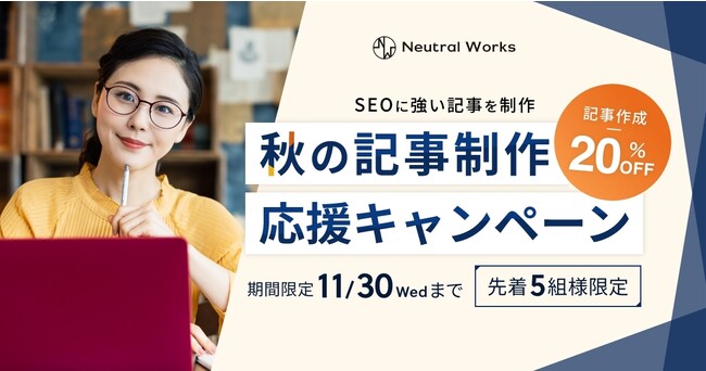 SEOに強みを持つニュートラルワークスが提供する「記事作成代行サービス( https://n-works.link/writing )」を、通常1記事50,000円(税別)のところ、期間限定で20%OFFの40,000円(税別)にてご利用いただけます。先着5組様までとなりますので、お早めにご応募ください。