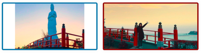 左が、バブルの頃から続く日本人的な写真の撮り方です。ここを訪れる日本人は、潜在的に釜石大観音と、橋を撮影します。そして、その写真が各種のSNSや、友人 / 家族へ拡散されていきます。