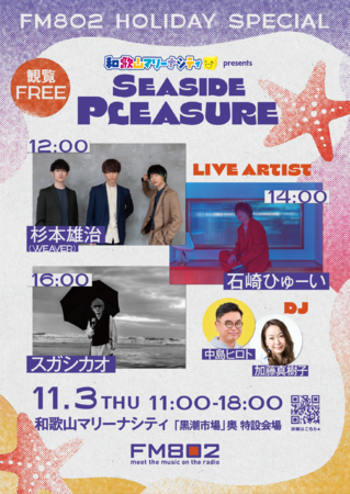 石崎ひゅーい、スガシカオ、杉本雄治(WEAVER)の3組が出演!文化の日のFM802は和歌山マリーナシティからの公開生放送。