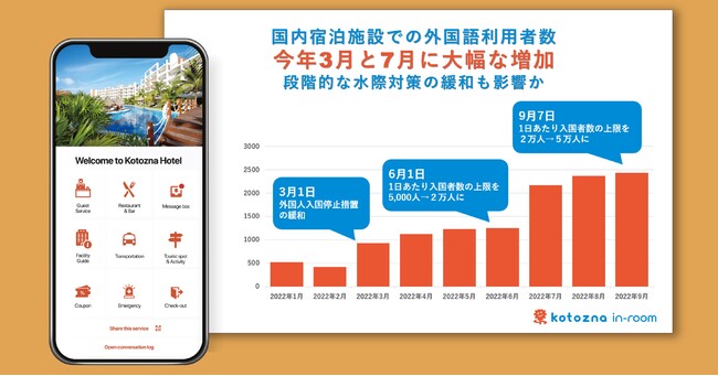 Kotozna株式会社(本社:東京都港区、代表取締役 後藤玄利、https://kotozna.com/ )は、当社が提供する宿泊施設向け多言語コミュニケーションツール「Kotozna In-room」利用データより、国内宿泊施設での外国語利用状況を調査しました。その結果、外国語利用者は、今年3月と7月に大幅な増加が見受けられました。今年段階的に行われている水際対策の緩和も影響していると見られます。9月に関しては微増となり、1日あたり入国者数の上限数が9月7日より2万人から5万人に引き上げられた緩和策については、影響が限定的となりました。10月11日より実施される水際対策の緩和に際して、「Kotozna In-room」導入の宿泊施設であるスターゲイトホテル関西エアポートでは「インバウンド回復の大きな一歩である」といった期待の声も挙がりました。
