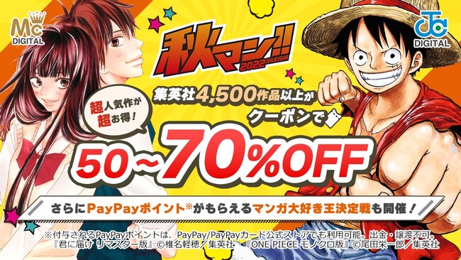 『ONE PIECE』や『チェンソーマン』など4,500作品以上がクーポンで最大70%OFF!「集英社×ebookjapan 秋マン!! 2022 クーポンキャンペーン」が10月8日からスタート!