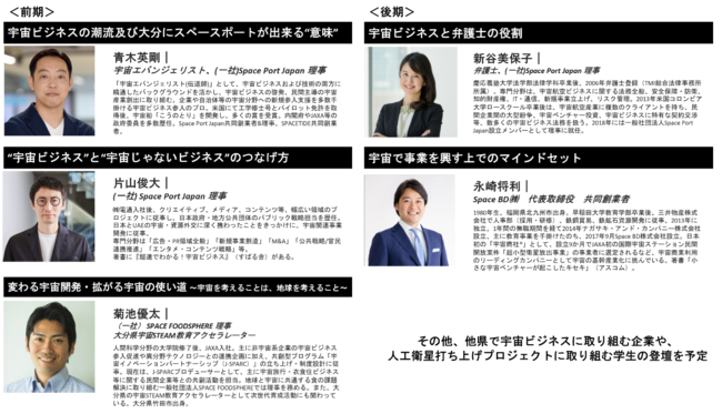 講座は前期と後期の2回に分かれており、既に実施した前期(7月26日~28日)の講座では、宇宙ビジネスの概観や具体的な事例について様々なゲスト講師にお話しいただくとともに、ワークショップではチーム別にて国際宇宙ステーション(ISS)の実験装置を用いたビジネスアイデアの検討を行っていただきました。11月9日~11日に予定している後期では、ビジネスアイデアのプレゼン審査会を行います。優勝チームのアイデアについては、Space BDがISSへの打上げ支援を行います。