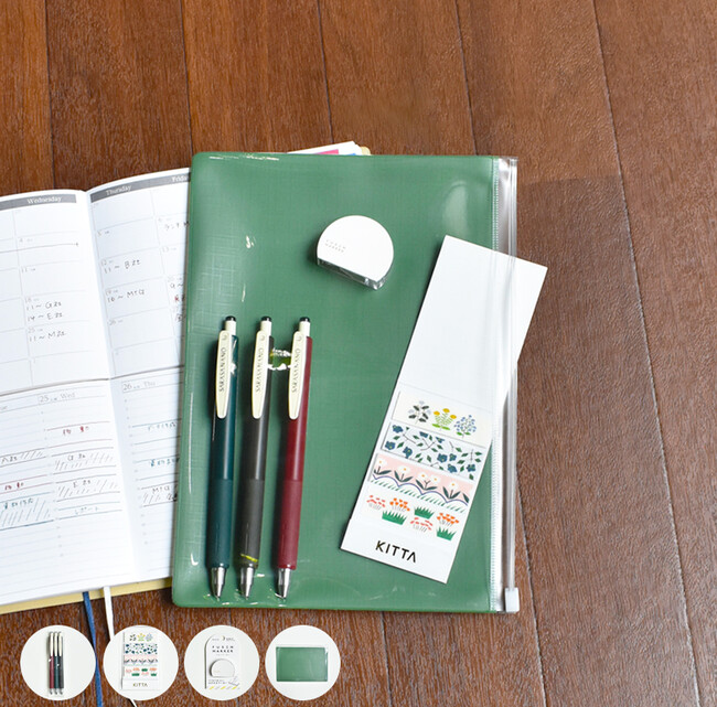 新セット商品「手帳と一緒に使いたい便利な文房具セット」廃棄待ちの手帳カバー原反から作ったクリアケースに収納して販売開始。届くまでクリアケースの色はお楽しみ/伊藤手帳ユメキロック