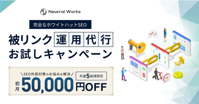 株式会社ニュートラルワークス(神奈川県茅ヶ崎市、代表取締役:三木五月/以下、ニュートラルワークス)では、2022年5月の提供開始から大好評を博している「被リンク運用代行サービス」のお試しキャンペーンを実施いたします。実績掲載にご協力いただける先着5組の企業様に、通常100,000円~(税別)のサービスを50,000円OFF(税別)でご提供いたします。