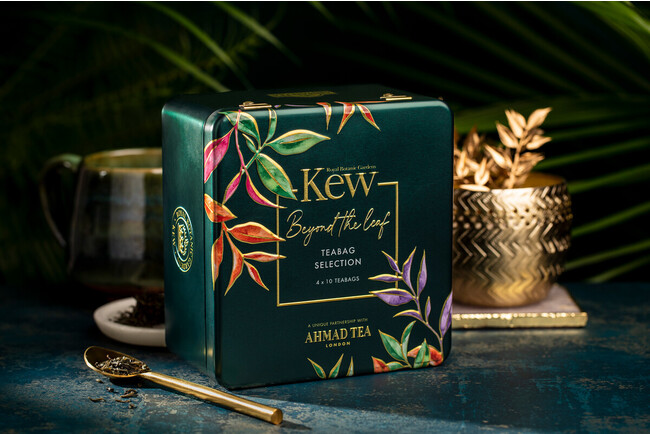 2022年3月より販売開始となったリーフティー缶(4アイテム)に加えてこの秋登場する新作は、4種類のティーバッグを1つに詰め合わせたセレクション缶。ボタニカルをコンセプトとした高級感のあるパッケージには、キューガーデンのロゴがあしらわれています。