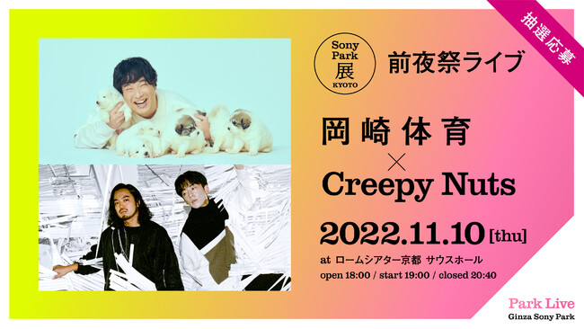 Sony Park展 KYOTOの開催を記念して、展示プログラムに参加している岡崎体育とCreepy Nutsによる“前夜祭ライブ”の開催が決定! Sony Park展 KYOTOの会期前夜にライブパフォーマンスで盛り上げます。なお、このイベントに参加される方を抽選でご招待します。イベントへの参加は無料です。ご希望の方はSony Park展 Webページより抽選にお申し込みください。