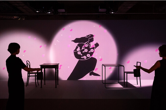 「大正浪漫 -NOVEL INTO MUSIC-」では、 YOASOBIの楽曲「大正浪漫」とともに、この原作小説の世界を体験いただけます。来場者が特別な「電灯」で壁面を照らすことで影絵のアニメーションが浮かび上がる、インタラクティブな映像体験です。ミュージックビデオとは、ひと味違った体験を通して、主人公たちの描かれた物語や楽曲の世界観をお楽しみいただけます。また、小説がプリントされたオリジナルポスター(数量限定)をお持ち帰りいただけます。