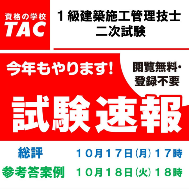 資格取得に向けた教育サービスを展開しているTAC株式会社(東京都千代田区、代表取締役社長: 多田 敏男)は、10/16(日)実施の1級建築施工管理技士二次試験に基づき、『総評』を試験翌日の10/17(月)17:00頃より、『参考答案例』を試験翌々日10/18(火)の18:00頃より、ホームページで公開いたします。