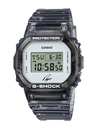 石川選手のシグネチャーモデル第3弾の『DW-5600RI22』は、初号機を受け継ぐ角型デザインの「DW-5600」をベースに、ベゼルやバンドにブラックのスケルトン樹脂を採用しシックにまとめた耐衝撃ウオッチです。