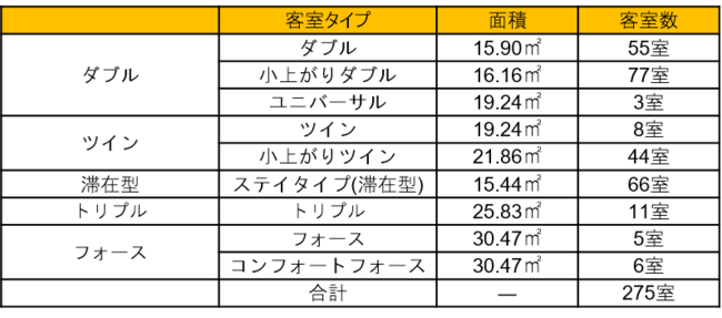 複数名での旅行等に対応するためダブル・ツインを中心とした構成です。トリプルルーム、フォースルームでは3名以上のお客さまにも対応可能です。中長期の滞在でも快適にお過ごしいただける滞在型客室もご用意しております。