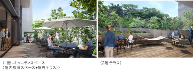 2階についても、ヒト・モノ・情報が集う地域コミュニティの創出の場として利活用いたします。早朝時間帯はホテル宿泊者向けの朝食会場として、それ以降の時間帯は来街者やビジネスパーソンもご利用可能なワーキングスペース、カフェ、ラウンジとして活用いたします。また、屋内ワーキングスペースとは違った、開放感があり気軽に利用できるテラスを併設します。