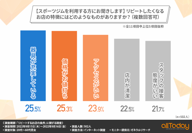 株式会社オールトゥデイ(本社所在地:埼玉県さいたま市)は、20代~60代男女を対象に【スポーツジム編】「リピートするお店の条件」に関する調査を実施しました。その結果を公表します。