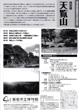 特別展「天覧山」では、飯能市立博物館の5人の学芸職員がそれぞれの視点・切り口から天覧山について新たな魅力を紹介します。さらに、三島由紀夫の「『美しい星』創作ノート」(山中湖文学の森・三島由紀夫文学館蔵)、戦前に作成された「ハンノウツツジ」の標本(東京大学大学院理学系研究科附属植物園蔵)など、飯能では初公開となる貴重な資料も展示します。また、アニメ「ヤマノススメ Next Summit」に関する展示もあります。