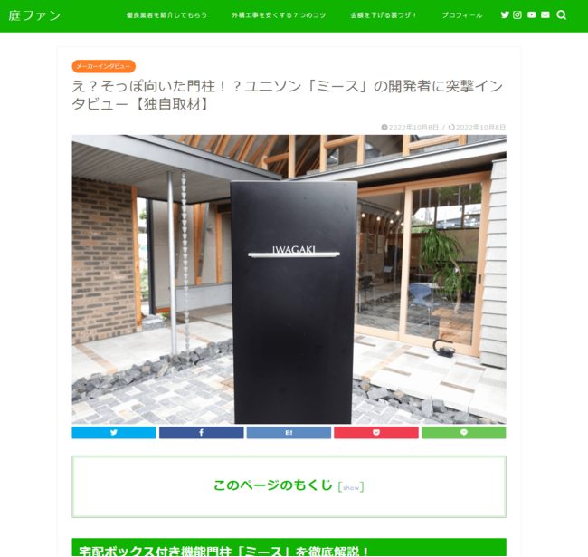 今回は、新商品の紹介記事・インタビューをさせていただきます。今後は、既存商品の掘り起こしも、実施していきたいです。庭ファン宛には、一般のユーザー様からの多数の質問が寄せられます。「その課題解決には、〇〇というメーカーの△△商品がぴったりです」「そのお悩みは、◯◯社の△△をこういう使い方をすれば解決できるよ」と、ご提案できる内容がまだまだあります。一般ユーザー様からのお声をもとに、新商品の開発のマーケティング資料として活用したり、一般ユーザー様はお庭のお悩みが少しづつ解決して、より良いお庭づくりの一助になれれば幸いです。今後も、一般ユーザー様とエクステリアメーカー様・資材メーカー様との架け橋になれるよう、これからも様々な取組みを続けてまいります。