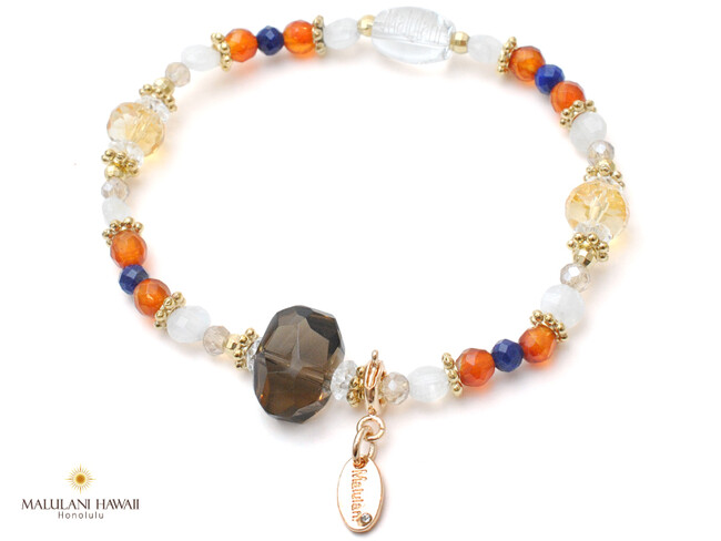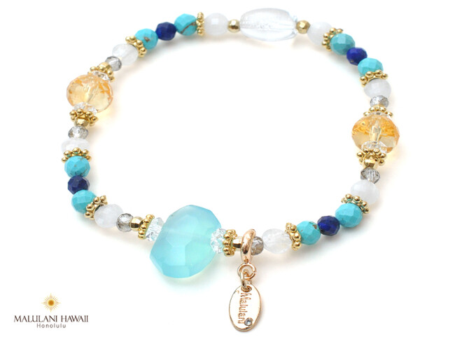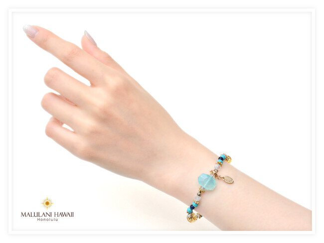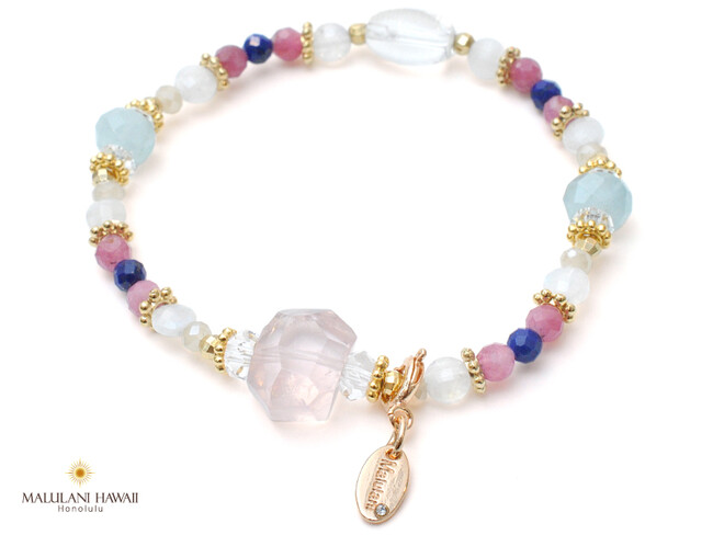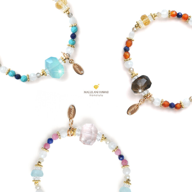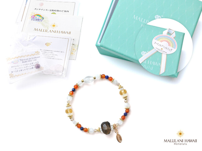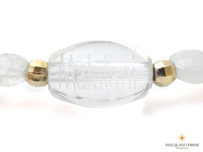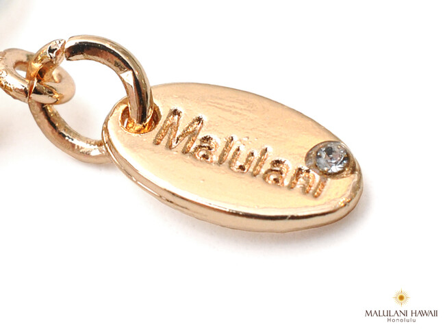 水晶とオリジナルチャームには、ハワイ語で「神に護られた」を意味する「Malulani」と刻印。