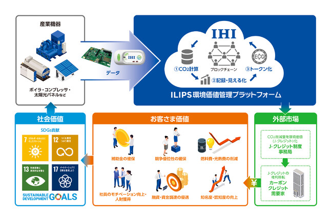IHIは、カーボンニュートラルに向けた取り組みの一環として、IHIのIoT基盤「ILIPS」を通じて取得した装置や設備の稼働データからCO2排出/削減量を算出し、ブロックチェーン技術を用いて可視化・環境価値化するデジタルプラットフォームを展開しています。現在、具体的なサービス実証を進めており、1.機器の稼働データやCO2排出量の見える化、2.CO2排出量/削減量のトレーサビリティ管理、3.CO2削減量のカーボンクレジット化(J-クレジットの創出)をワンストップソリューションで提供し、お客さまの脱炭素化に関するお困りごとの解決を提案しています。
