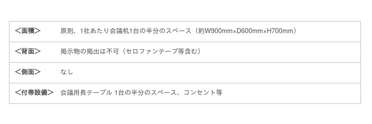 ※ポスター等の掲示や商品の設置のみですので、ブース設置・飾付において、専門業者の手配は不可とします。