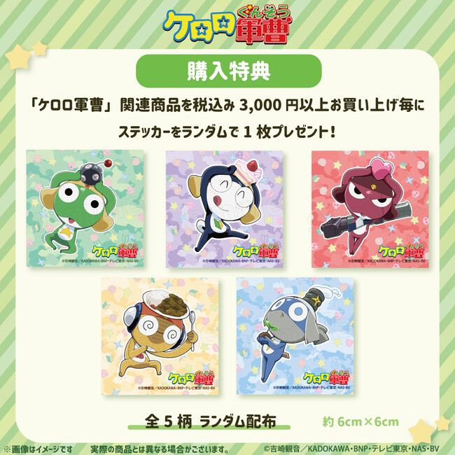 ケロロ軍曹POP UP SHOPにて、対象商品を税込み3,000円以上お買い上げ毎に、ランダムでオリジナルノベルティをプレゼント!この機会にかわいいノベルティをGETしちゃおう!