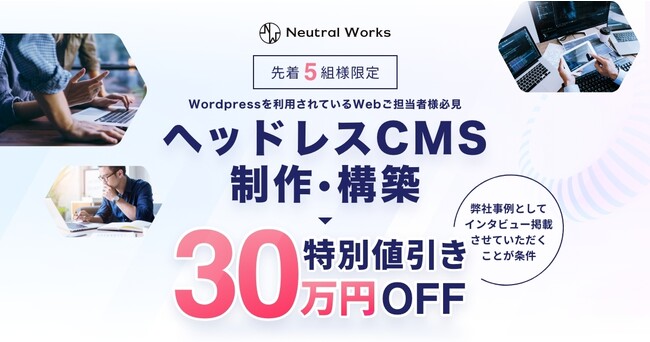 株式会社ニュートラルワークス(神奈川県茅ヶ崎市、代表取締役:三木五月/以下、ニュートラルワークス)は、2022年10月18日より「ヘッドレスCMS制作・構築」の特別値引きキャンペーンを実施いたします。制作実績としてインタビュー掲載にご協力いただける先着5組様に限り、本サービスが通常価格から300,000円OFFとなるキャンペーンです。