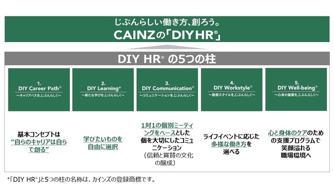 DIY HR(R)は、カインズが2021年9月にリリースした新たな人事戦略です。カインズには、くらしを良くするために自分で創意工夫すること全てが「DIY(Do It Yourself)」であるというDIY思想があります。DIY HR(R)の基本コンセプトは、その思想を組織文化へも浸透させようというものです。DIY HR(R)は、DIY Career Path(R)、DIY Learning(R)、DIY Communication(R)、DIY Workstyle(R)、DIY Well-being(R)の5つの柱から成り立っています。その柱ごとに展開されている施策によって、正社員だけでなく、店舗で働くパート・アルバイトを含めた全てのメンバーの顕在的、潜在的な個の力を引き出し、組織パフォーマンスを最大化することを目指しています。